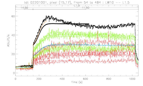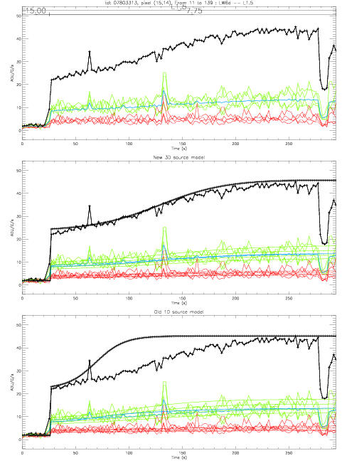 Par contre, ceci n'est plus vrai lorsqu'il y a un gradient d'illumination entre pixels voisins. Il est facile de voir cet effet, grâce au jitter du satellite. Le satellite ISO est affecté par un très faible jitter (faible depointage autour de la direction de pointage de reference). Lorsqu'on pointe vers une source ponctuelle, les transitoires des pixels non centraux de la source sont très bruites, sans commune mesure avec le bruit sous éclairement uniforme. Ce bruit est la consequence de l'absence de moyenne sur les courants sous fort gradient. Mais on retrouve ce qui confirme que ce bruit est bien correlé entre les pixels de la source.