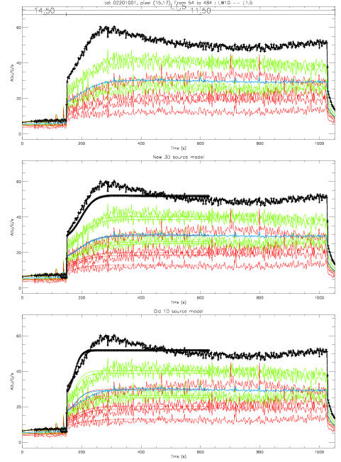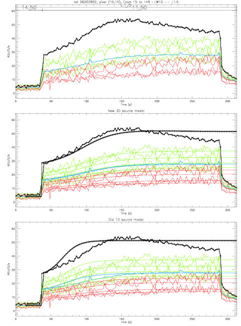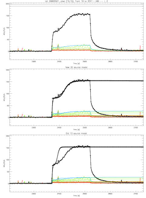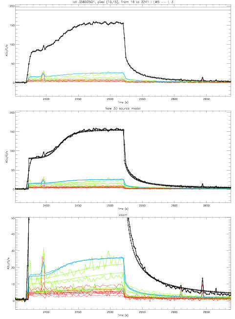 Un exemple de description des transitoires en descente : (figure du haut : données brutes, figure du milieu : modélisation des montées et descentes, figure du bas : zoom sur la descente) | Pour les sources larges, il faut rajouter un terme correctif de premier ordre pour la première phase de montée (avant le maximum). Sur cet exemple, on a rajouté (en orange) cette correction supplémentaire. |